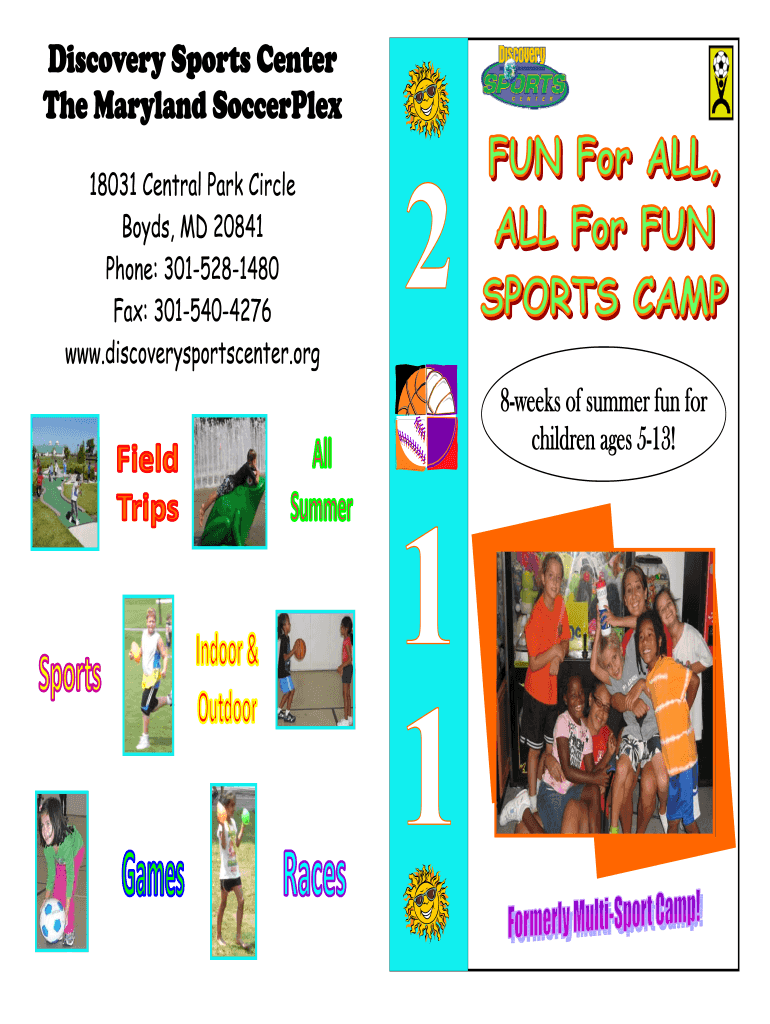 Discovery Sports Center The Maryland SoccerPlex 18031 Central Park Circle Boyd's, MD 20841 Phone: 3015281480 Fax: 3015404276 www.discoverysportscenter.org 8weeks of summer fun for children ages 513!