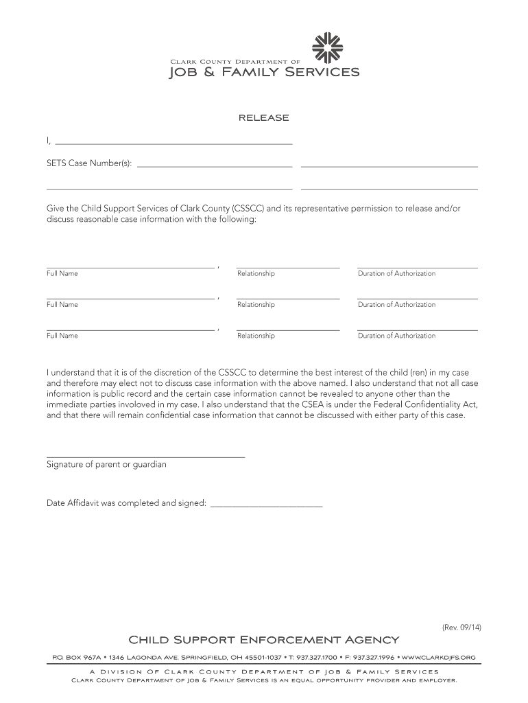 Release I, SETS Case Number(s): Give the Child Support Services of Clark County (CS SCC) and its representative permission to release and/or discuss reasonable case information with the following:,