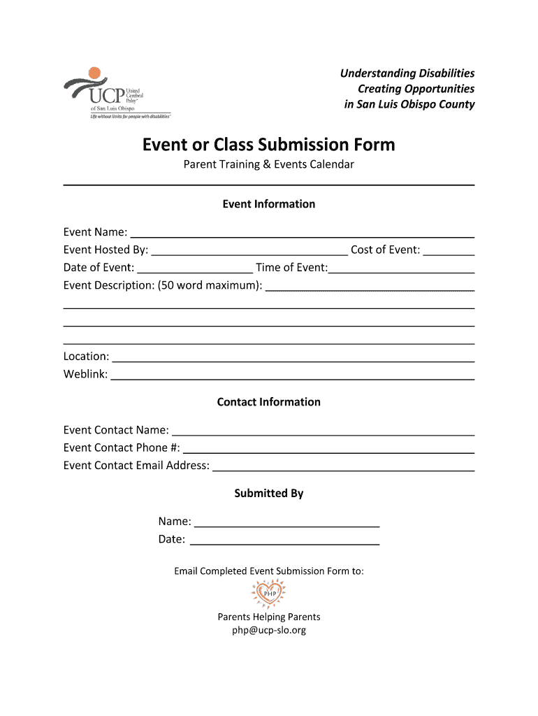 Understanding Disabilities Creating Opportunities in San Luis Obispo County Event or Class Submission Form Parent Training & Events Calendar Event Information Event Name: Event Hosted By: Date of