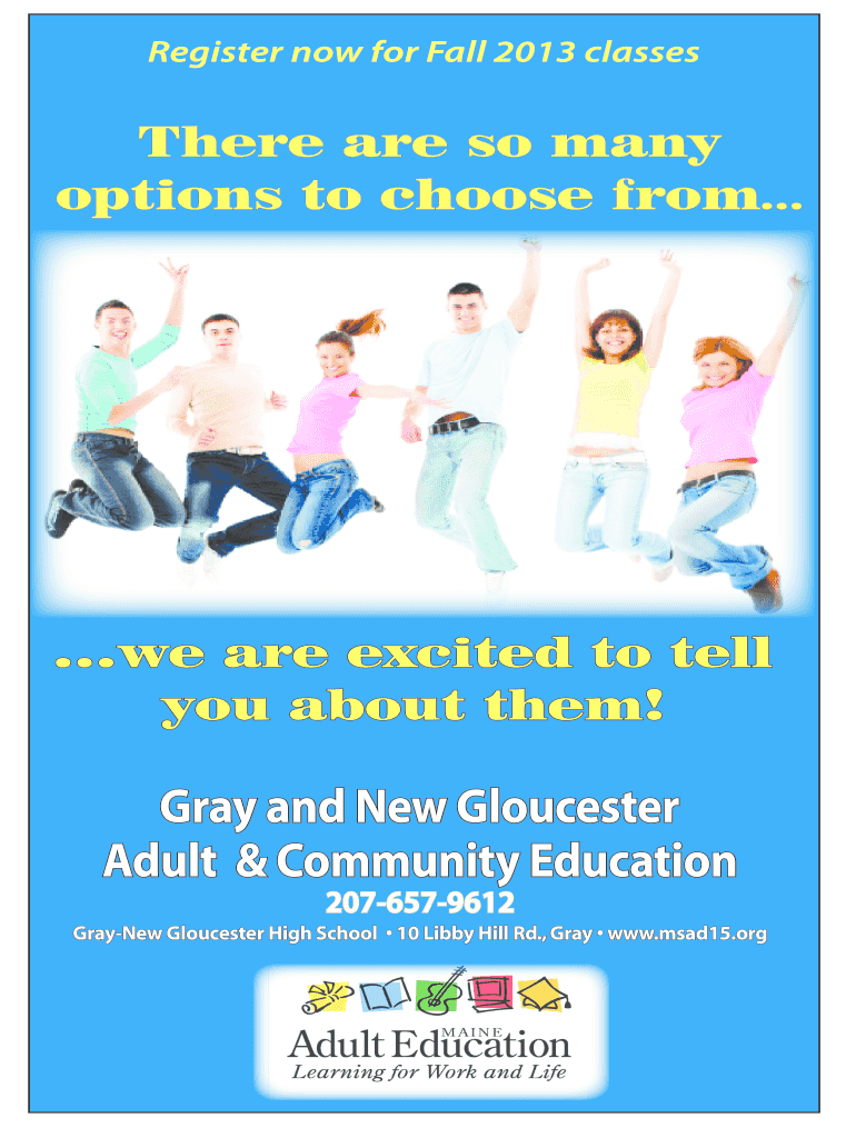 Register now for Fall 2013 classes There are so many options to choose from... ...we are excited to tell you about them! Gray.and. New. Gloucester. Adult.&. Community. Education 2076579612 Grained.