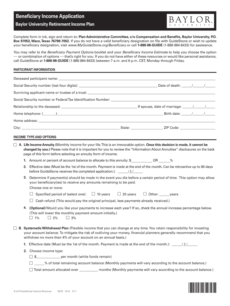 Get the free Beneficiary Income Application - guidestoneretirement