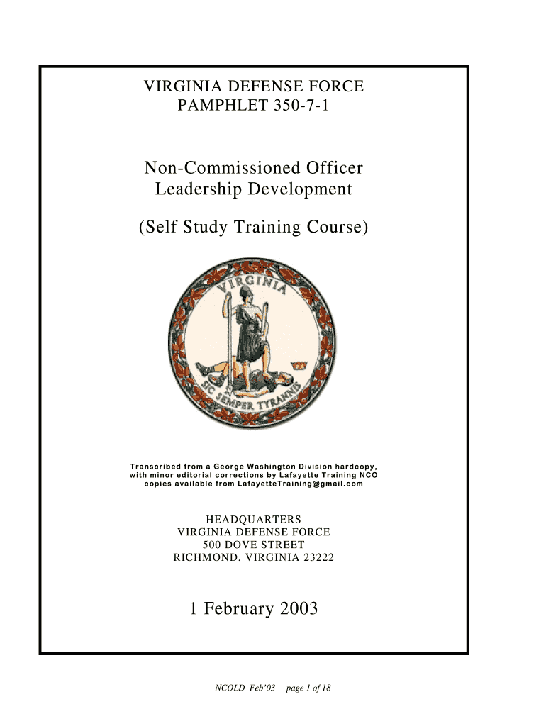 VIRGINIA DEFENSE FORCE PAMPHLET 35071 Commissioned Officer Leadership Development (Self Study Training Course) T r a NS c r i b e d f r on a G e or g e W an s hi NG t o n D i v i s i o n h an r d