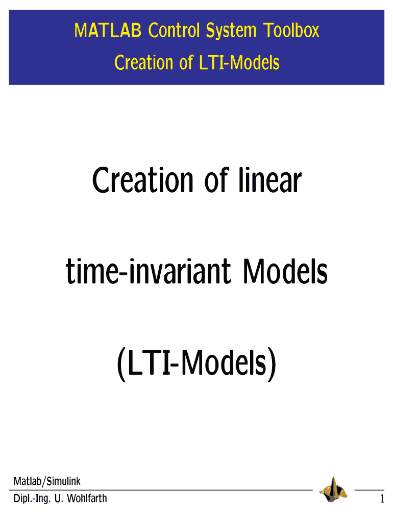 MATLAB Control System Toolbox Creation of LTIModelsCreation of linear time invariant Models (Models)Matlab/Simulink Dial. ING. U. Wohlfarth1MATLAB Control System Toolbox Linear, time invariant modes