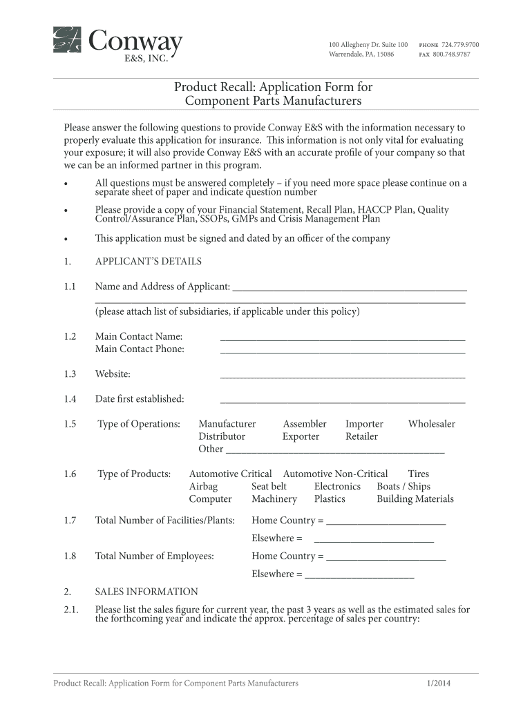 100 Allegheny Dr. Suite 100 Warren dale, PA, 15086 phones 724.779.9700 fax 800.748.9787 Product Recall: Application Form for Component Parts Manufacturers Please answer the following questions to