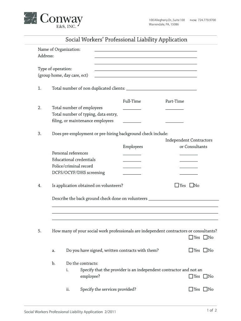 100 Allegheny Dr., Suite 100 Warren dale, PA, 15086 724.779.9700 Fax 724.779.9701 phone Social Workers Professional Liability Application Name of Organization: Address: Type of operation: (group home,