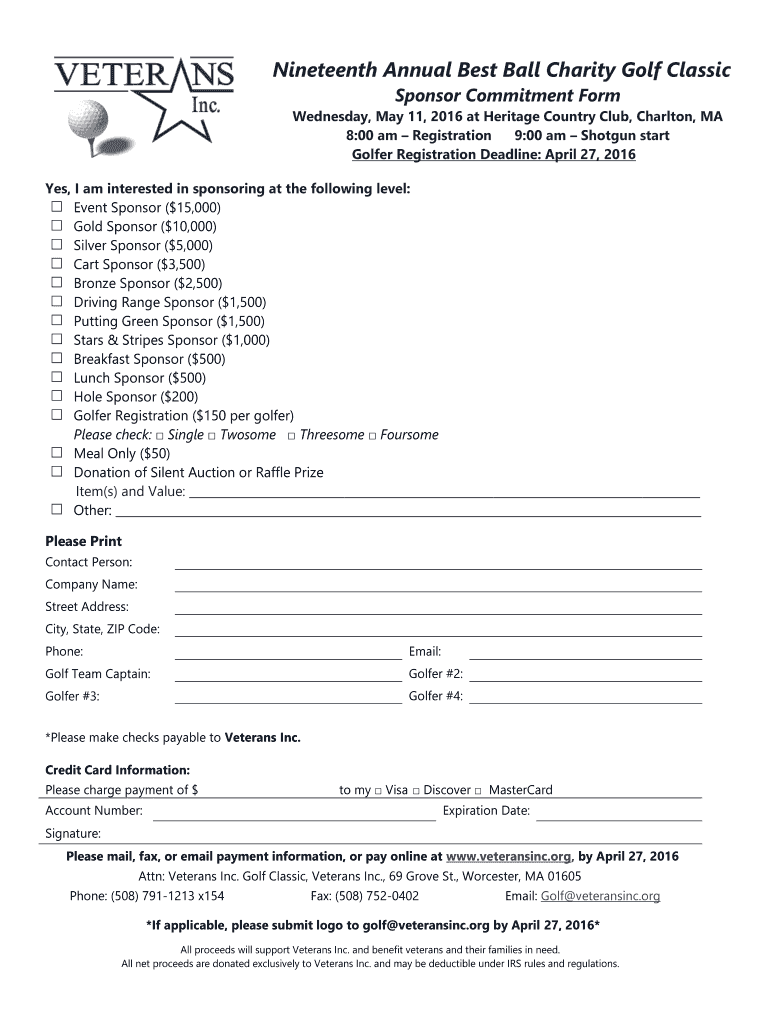 Nineteenth Annual Best Ball Charity Golf Classic Sponsor Commitment Form Wednesday, May 11, 2016, at Heritage Country Club, Charlton, MA 8:00 am Registration 9:00 am Shotgun start Golfer Registration