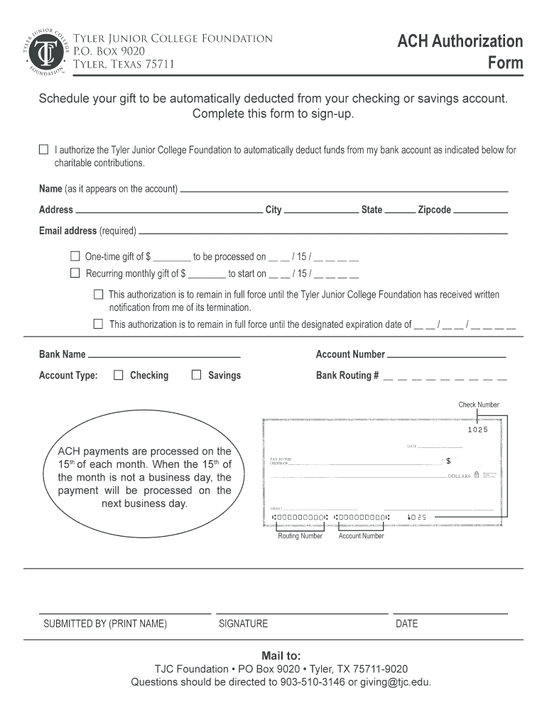 ACH Authorization Form Tyler Junior College Foundation P.O. Box 9020 Tyler, Texas 75711 Schedule your gift to be automatically deducted from your checking or savings account. Complete this form to