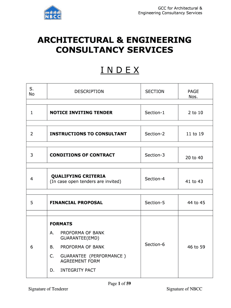 GCC for Architectural & Engineering Consultancy Services ARCHITECTURAL & ENGINEERING CONSULTANCY SERVICES INDEX S. No DESCRIPTION SECTION PAGE Nos. 1 NOTICE INVITING TENDER Section1 2 to 10 2 INSTRUCTIONS