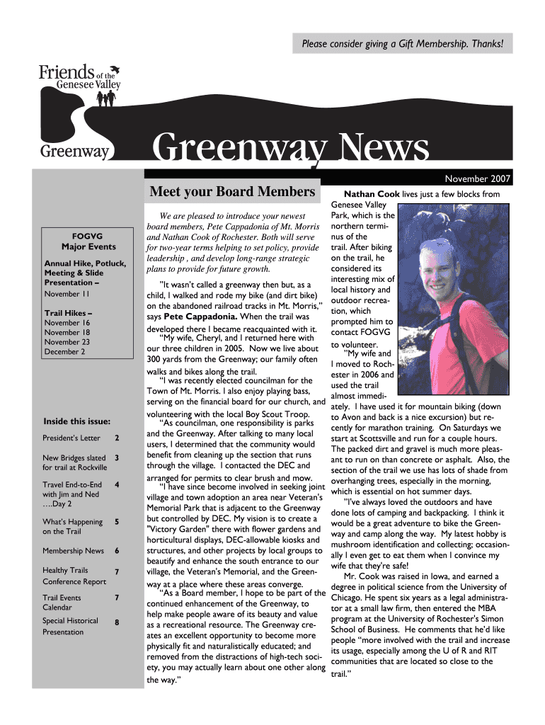 Please consider giving a Gift Membership. Thanks! November 2007 Meet your Board Members FOGVG Major Events Annual Hike, Potluck, Meeting & Slide Presentation November 11 Trail Hikes November 16