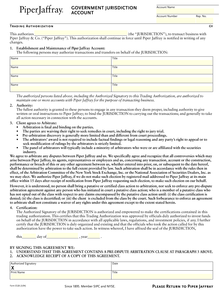 GOVERNMENT JURISDICTION ACCOUNT Name Since 1895. Member SIPC, NYSE, Inc. Account Number Rep. No. Complete online, print and sign as appropriate. Trading Authorization PRINT RESET GV This authorizes