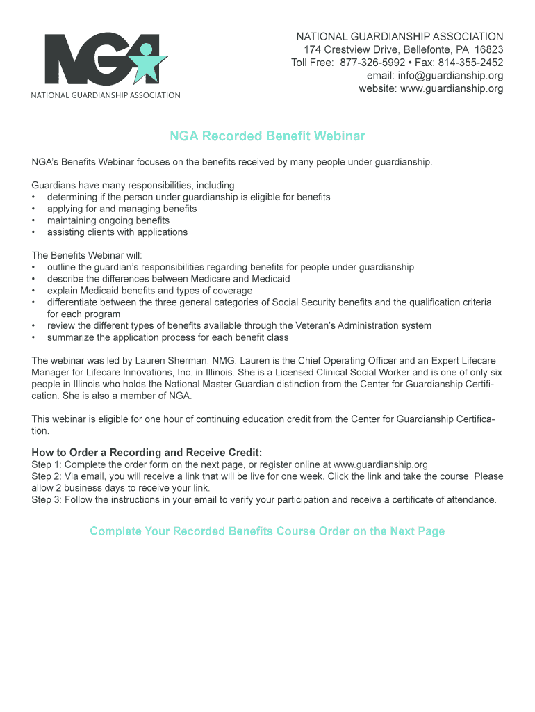 NATIONAL GUARDIANSHIP ASSOCIATION 174 Crestview Drive, Belmonte, PA 16823 Toll Free: 8773265992 Fax: 8143552452 email: info guardianship.org website: www.guardianship.org NGA Recorded Benefit Webinar