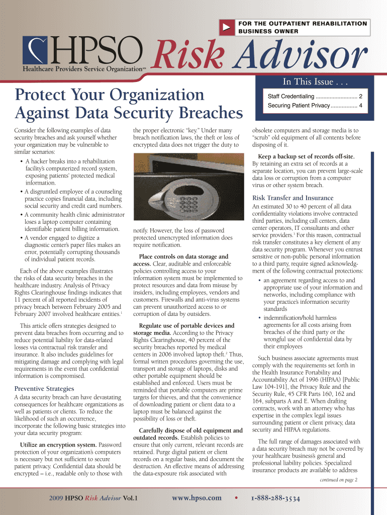 FOR THE OUTPATIENT REHABILITATION BUSINESS Owners Advisor In This Issue. . . Protect Your Organization Against Data Security Breaches Consider the following examples of data security breaches and