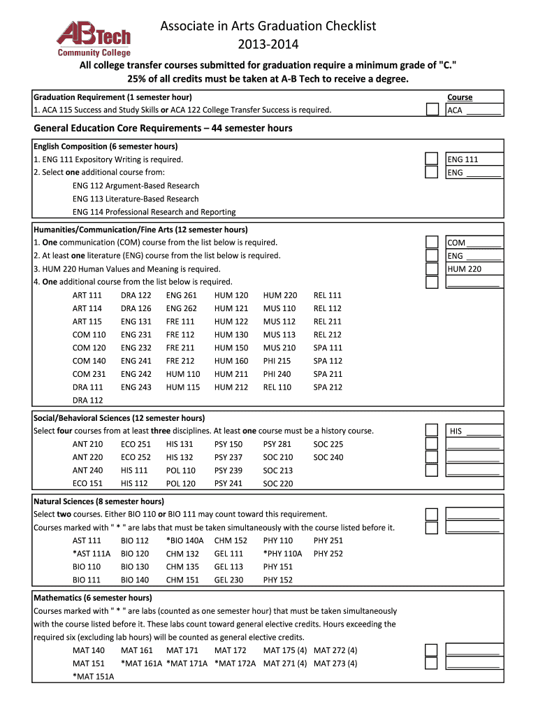 Associate in Arts Graduation Checklist 20132014 All college transfer courses submitted for graduation require a minimum grade of “C. “ 25% of all credits must be taken at AB Tech to receive a