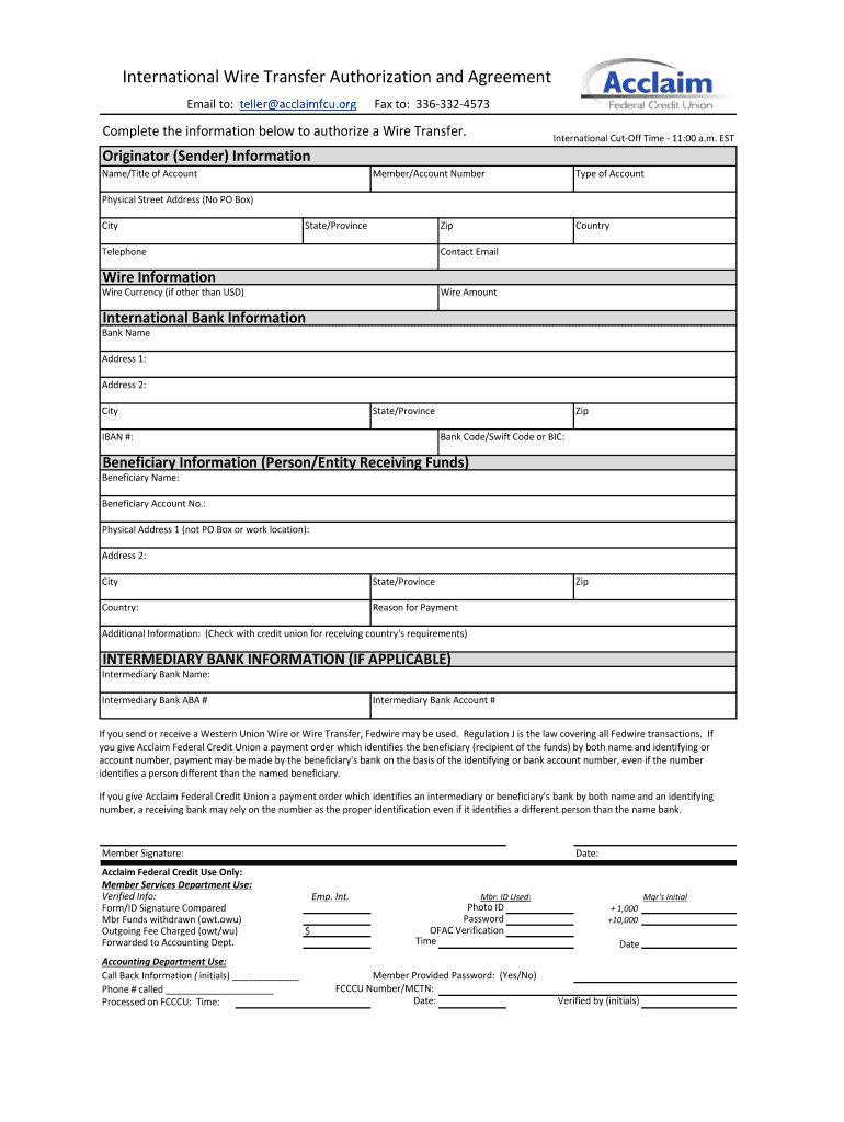 International Wire Transfer Authorization and Agreement Email to: teller acclaimed.org Fax to: 3363324573 Complete the information below to authorize a Wire Transfer. International Cutoff Time 11:00