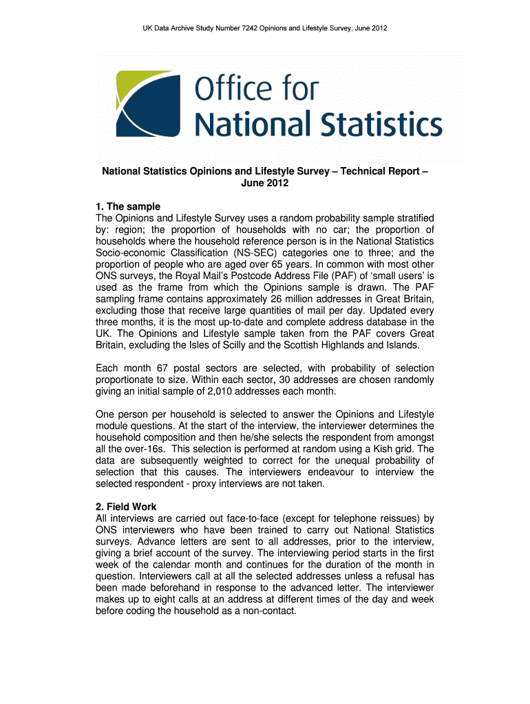 UK Data Archive Study Number 7242 Opinions and Lifestyle Survey, June 2012 National Statistics Opinions and Lifestyle Survey Technical Report June 2012 1. The sample The Opinions and Lifestyle Survey