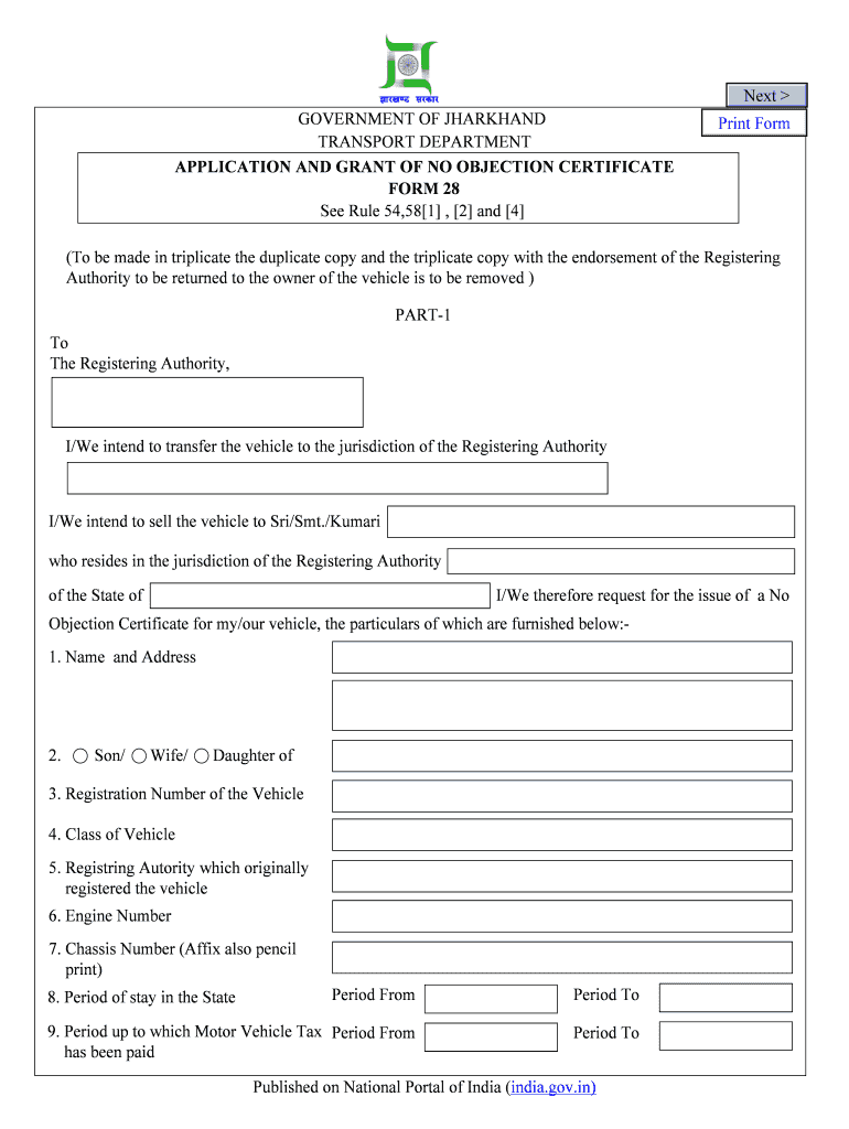 Next GOVERNMENT OF JHARKHAND TRANSPORT DEPARTMENT APPLICATION AND GRANT OF NO OBJECTION CERTIFICATE FORM 28 See Rule 54,58 1, 2 and 4 Print Form (To be made in triplicate the duplicate copy and the