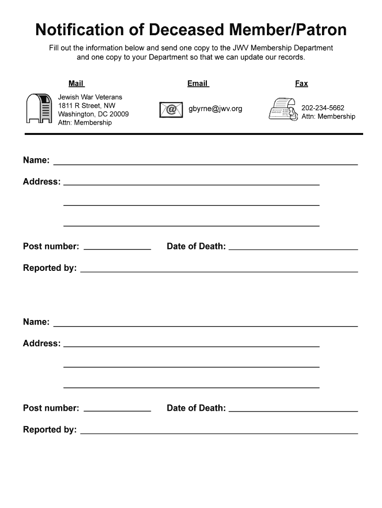 Notification of Deceased Member/Patron Fill out the information below and send one copy to the BWV Membership Department and one copy to your Department so that we can update our records. Mail Jewish