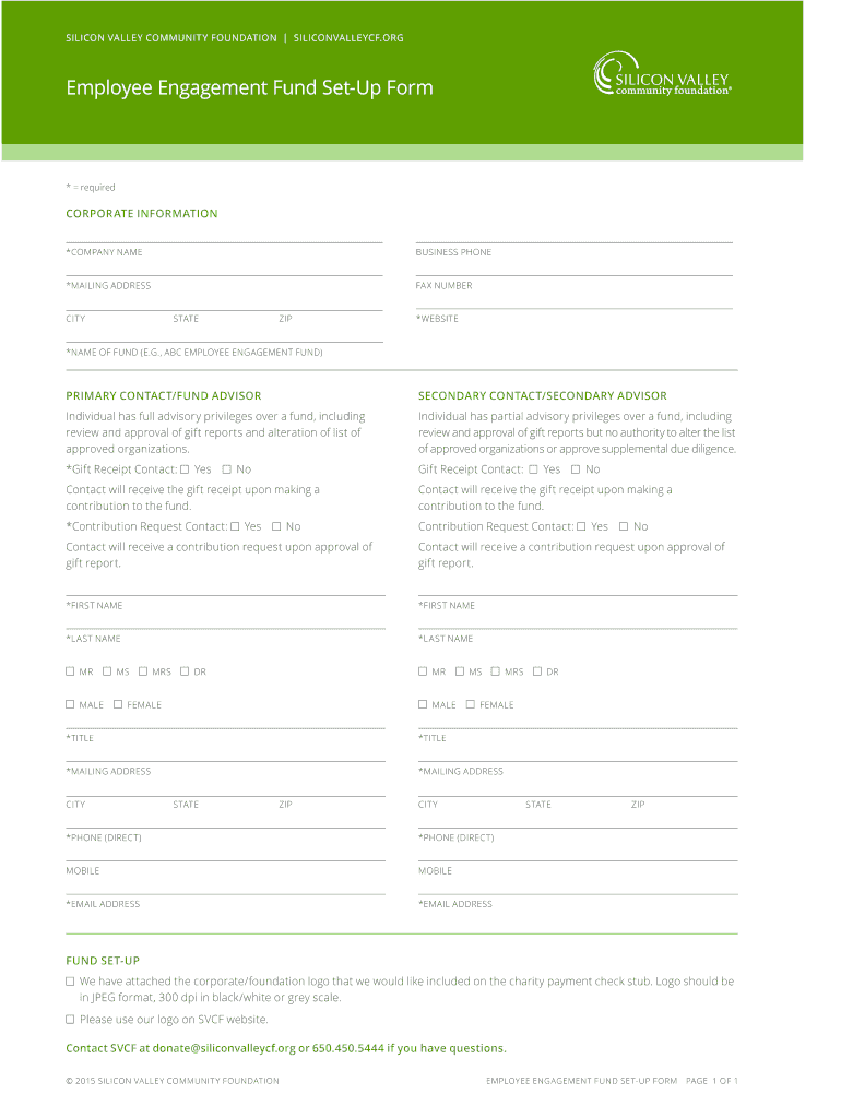 SETUP FORM SILICON VALLEY COMMUNITY Y FOUNDATION Silicon Valley.ORG Employee Engagement Fund SetUp Form * required CORPORATE INFORMATION *COMPANY NAME BUSINESS PHONE *MAILING ADDRESS FAX NUMBER CIT