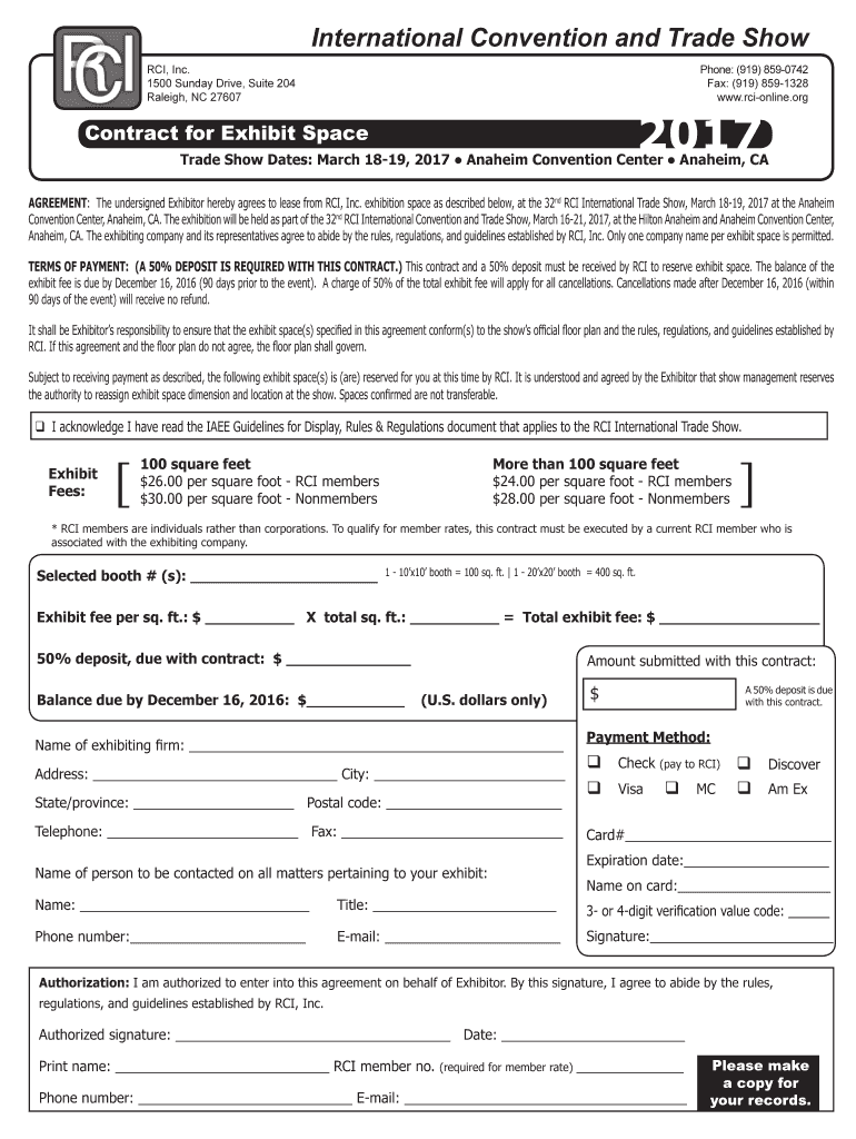 International Convention and Trade Show RCI, Inc. 1500 Sunday Drive, Suite 204 Raleigh, NC 27607 Phone: (919) 8590742 Fax: (919) 8591328 www.rcionline.org 2017 Contract for Exhibit Space Trade Show