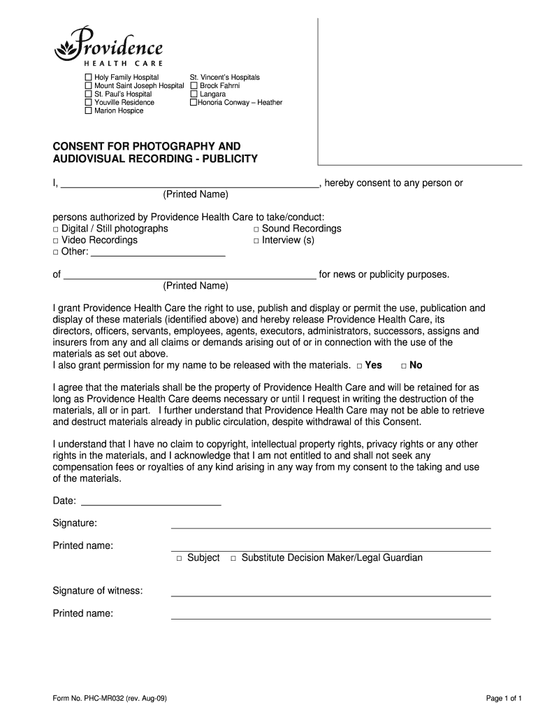 Holy Family Hospital St. Vincent's Hospitals Mount Saint Joseph Hospital Brock Farsi St. Paul's Hospital Angara Orville Residence Honor Conway Heather Marion Hospice CONSENT FOR PHOTOGRAPHY AND AUDIOVISUAL