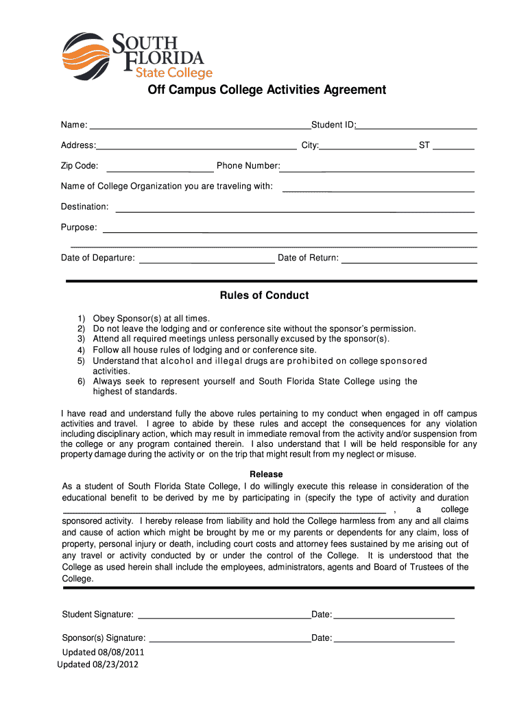 Off Campus College Activities Agreement Name: Student ID: Address: Zip Code: City: ST Phone Number: Name of College Organization you are traveling with: Destination: Purpose: Date of Departure: Date