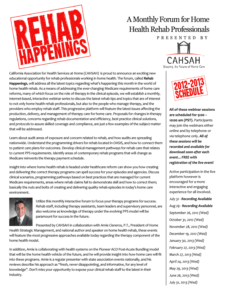 A Monthly Forum for Home Health Rehab Professionals P R E S E N T E D California Association for Health Services at Home (CAH SAH) is proud to announce an exciting new educational opportunity for