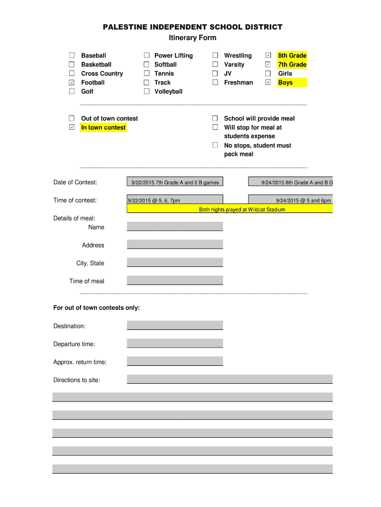 PALESTINE INDEPENDENT SCHOOL DISTRICT Itinerary Form Baseball Basketball Cross Country Football Golf Power Lifting Softball Tennis Track Volleyball Wrestling Varsity JV Freshman Out-of-town contest