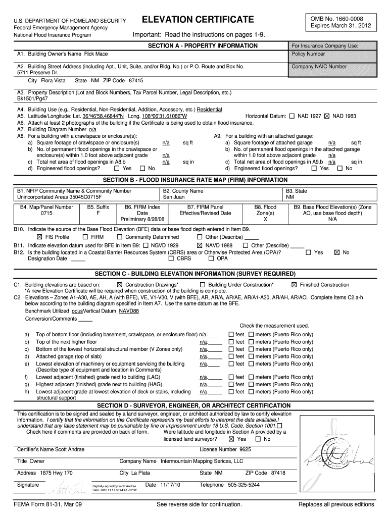 U.S. DEPARTMENT OF HOMELAND SECURITY Federal Emergency Management Agency National Flood Insurance Program ELEVATION CERTIFICATE OMB No. 16600008 Expires March 31, 2012, Important: Read the instructions