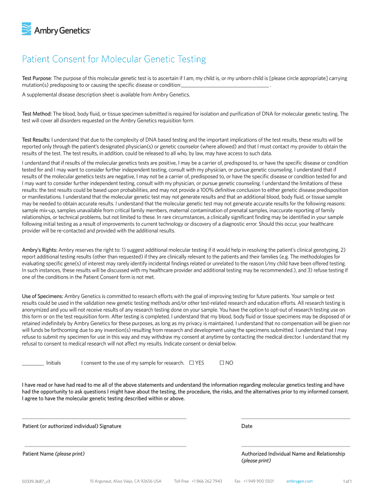 Patient Consent for Molecular Genetic Testing Test Purpose: The purpose of this molecular genetic test is to ascertain if I am, my child is, or my unborn child is please circle appropriate carrying