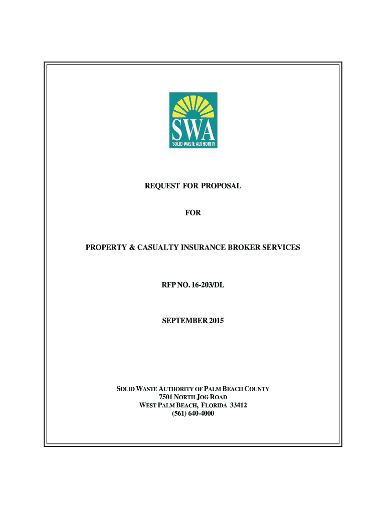REQUEST FOR PROPOSAL FOR PROPERTY & CASUALTY INSURANCE BROKER SERVICES RFP NO. 16203/DL SEPTEMBER 2015 SOLID WASTE AUTHORITY OF PALM BEACH COUNTY 7501 NORTH JOG ROAD WEST PALM BEACH, FLORIDA 33412