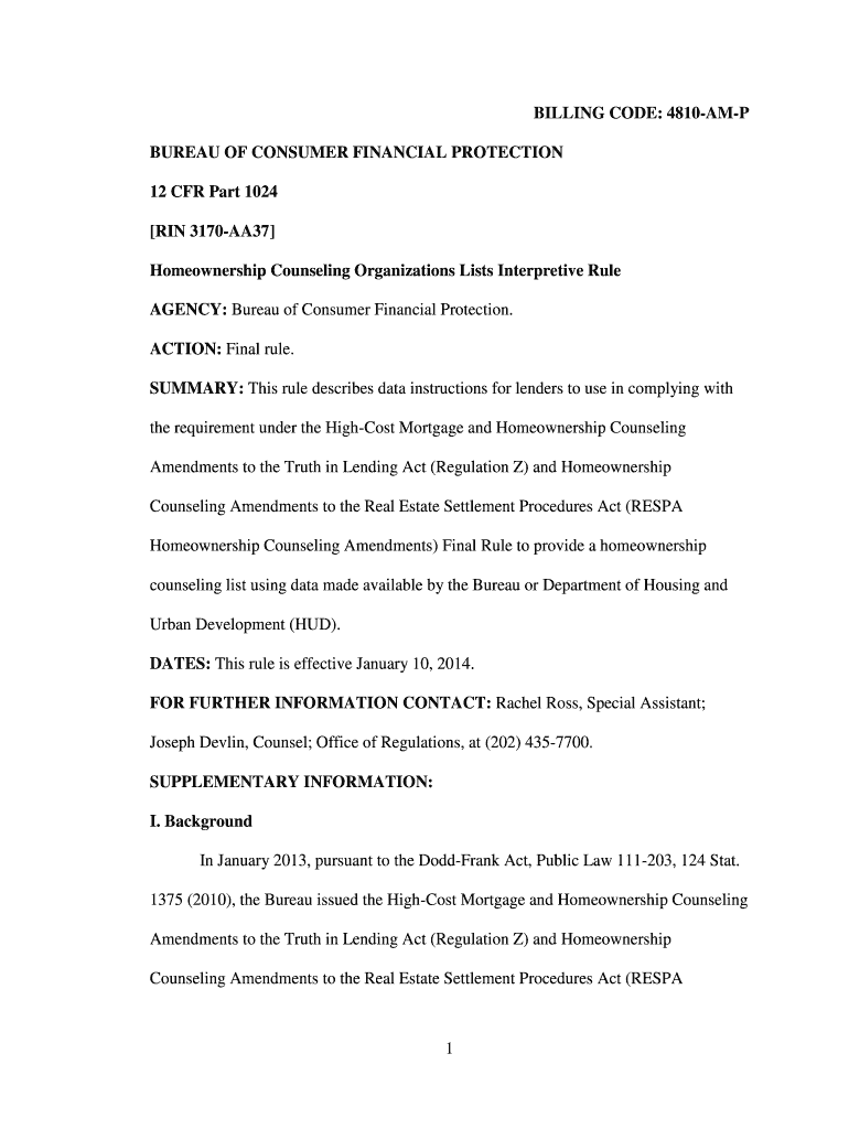 BILLING CODE: 4810AMP BUREAU OF CONSUMER FINANCIAL PROTECTION 12 CFR Part 1024 IN 3170AA37 Homeownership Counseling Organizations Lists Interpretive Rule AGENCY: Bureau of Consumer Financial Protection.