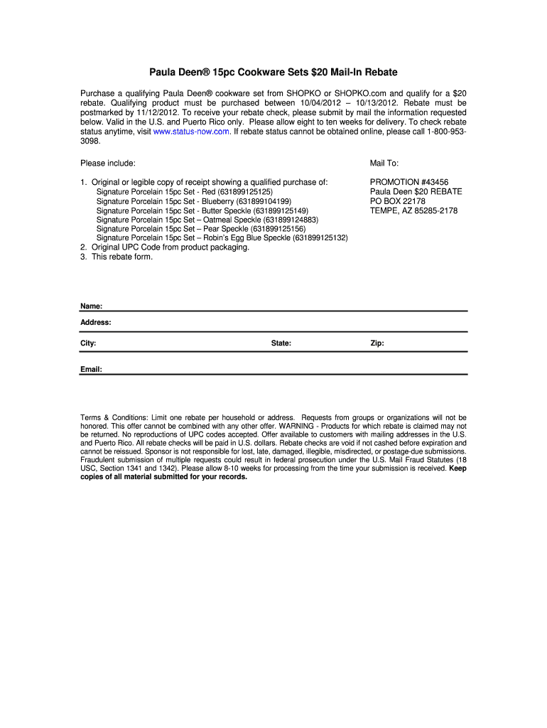 Get the free Paula Deen 20 Shopko Rebate Form 434561doc