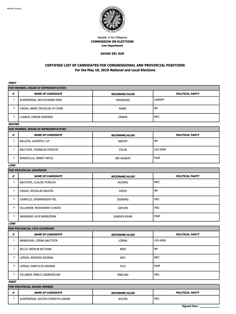 PRINTED: 01/30/10 Republic of the Philippines COMMISSION ON ELECTIONS Law Department DAVAO DEL SUR CERTIFIED LIST OF CANDIDATES FOR CONGRESSIONAL AND PROVINCIAL POSITIONS For the May 10, 2010, National