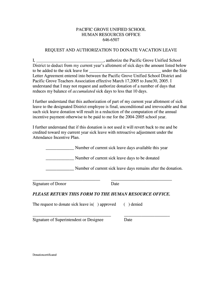 PACIFIC GROVE UNIFIED SCHOOL HUMAN RESOURCES OFFICE 6466507 REQUEST AND AUTHORIZATION TO DONATE VACATION LEAVE I, authorize the Pacific Grove Unified School District to deduct from my current years