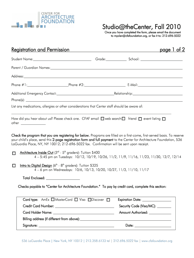 Studio recenter, Fall 2010 Once you have completed the form, please email the document to stolen foundation.org, or fax it to: 2126965022 Registration and Permission page 1 of 2 Grade: Student Name:
