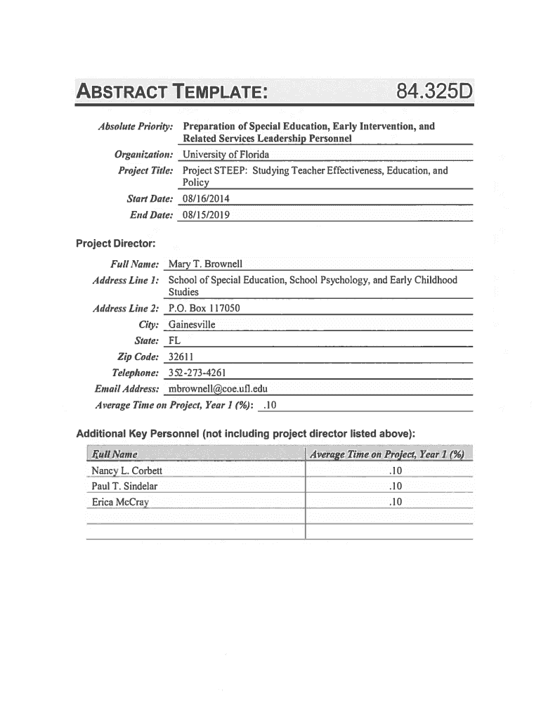 84.3250 ABSTRACT TEMPLATE: Absolute Priority: Orga11izati011: Project Title: Preparation of Special Education, Early Intervention, and Related Services Leadership Personnel University of Florida Project