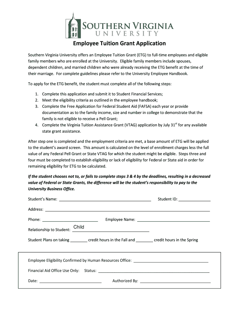 Southern Virginia University offers an Employee Tuition Grant (ETC) to full time employees and eligible