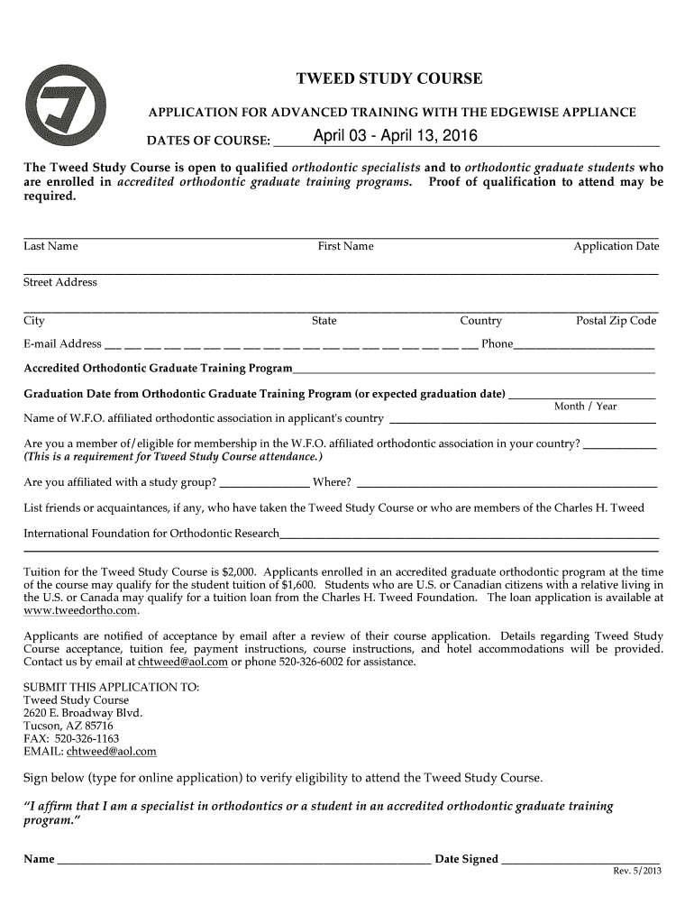 TWEED STUDY COURSE APPLICATION FOR ADVANCED TRAINING WITH THE EDGEWISE APPLIANCE April 03 April 13, 2016, DATES OF COURSE: The Tweed Study Course is open to qualified orthodontic specialists and to