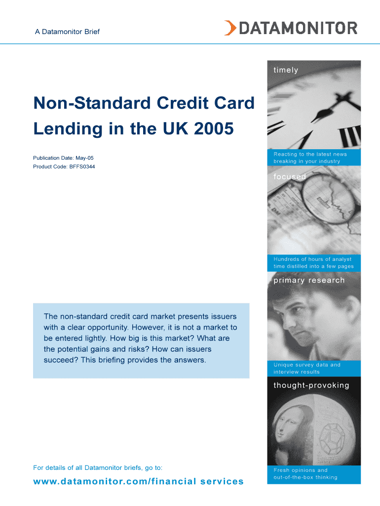 A Data monitor Brief timely Nonstandard Credit Card Lending in the UK 2005 Publication Date: May05 Product Code: BFFS0344 Reacting to the latest news breaking in your industry focused Hundreds of