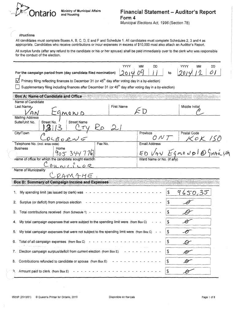 ! ');..., : ::. 'i. It:., Ontario Ministry of Municipal Affairs and Housing Financial Statement Auditor's Report Form4 Municipal Elections Act, 1996 (Section 78) ;ructions All candidates must complete