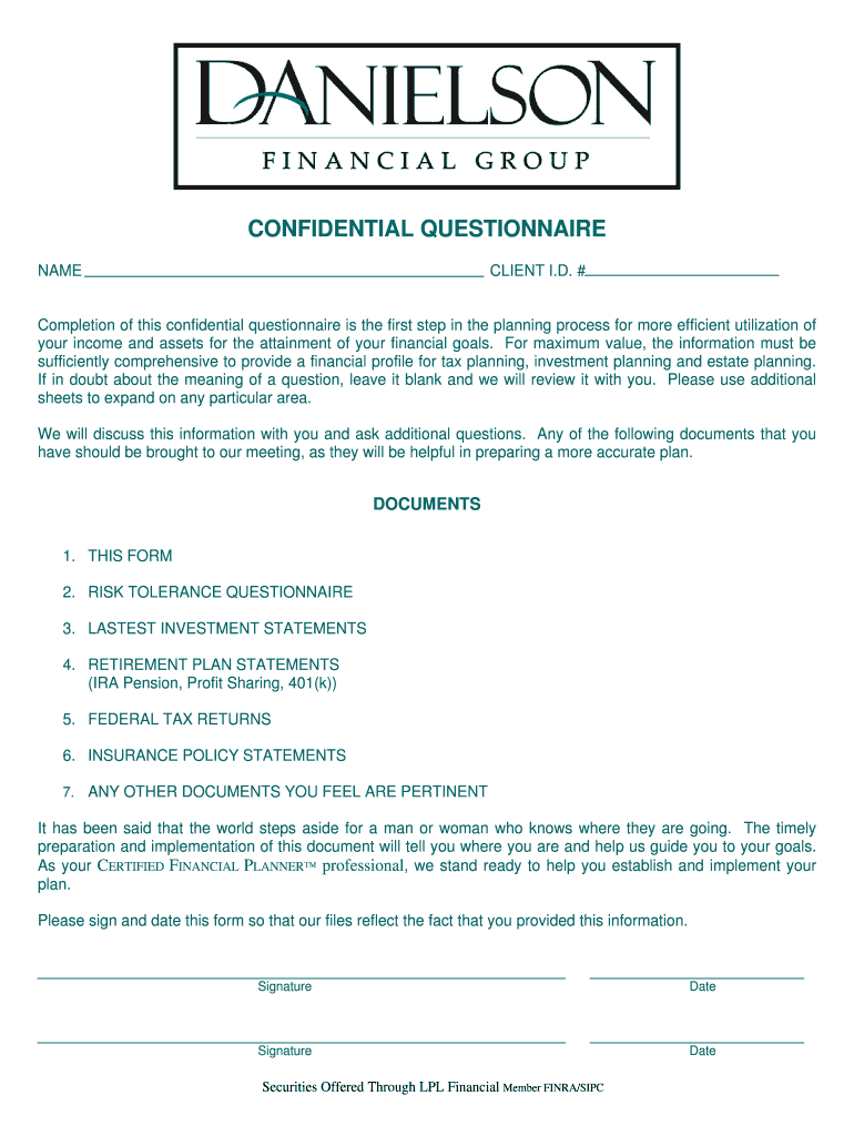 CONFIDENTIAL QUESTIONNAIRE NAME CLIENT I.D. # Completion of this confidential questionnaire is the first step in the planning process for more efficient utilization of your income and assets for the