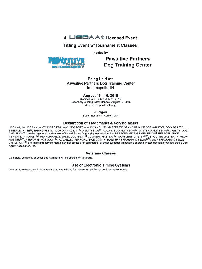 A Licensed Event Titling Event w/Tournament Classes hosted by Positive Partners Dog Training Center Being Held At: Positive Partners Dog Training Center Indianapolis, On August 15 16, 2015 ClosingDate:Friday,July31,2015
