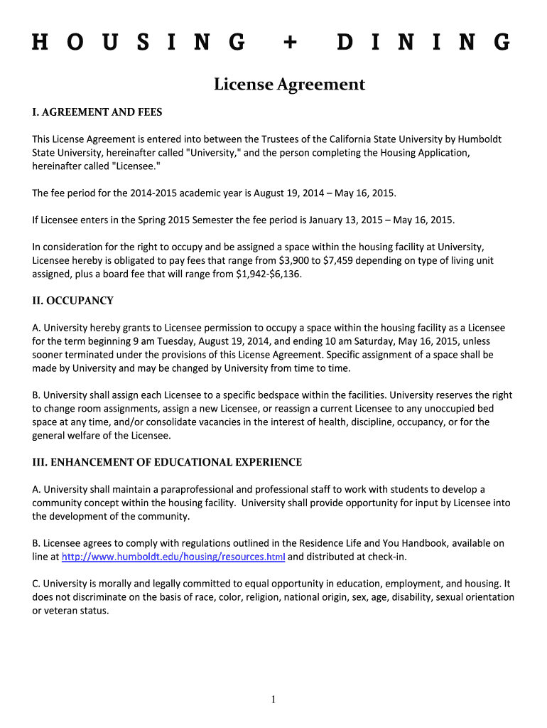 License Agreement I. AGREEMENT AND FEES This License Agreement is entered into between the Trustees of the California State University by Humboldt State University, hereinafter called “University,