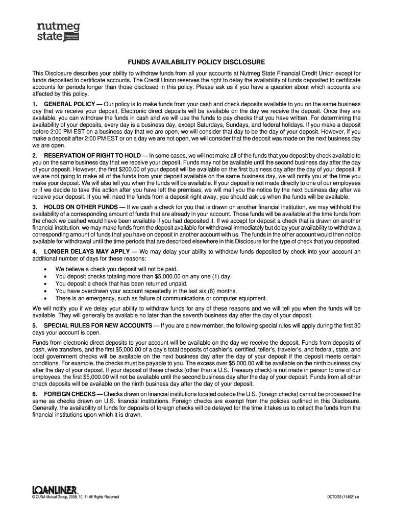 FUNDS AVAILABILITY POLICY DISCLOSURE This Disclosure describes your ability to withdraw funds from all your accounts at Nutmeg State Financial Credit Union except for funds deposited to certificate