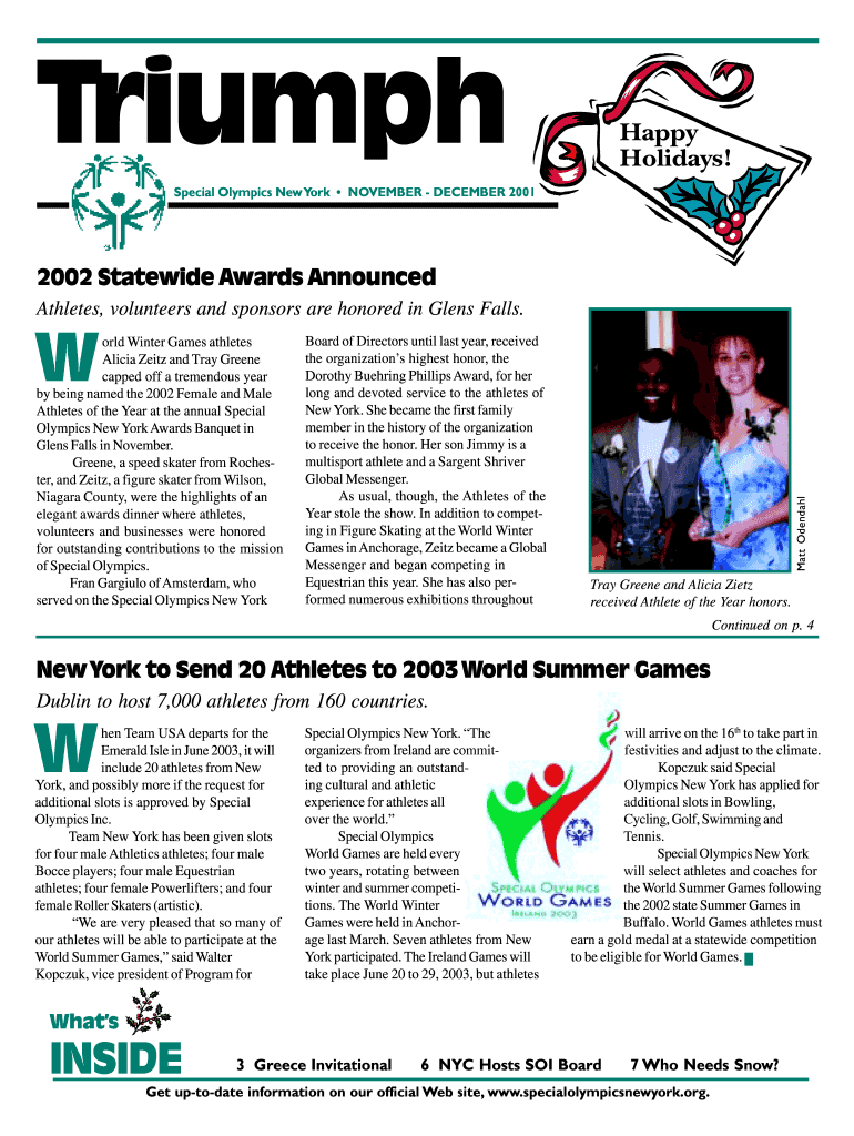 Triumph Special Olympics New York NOVEMBER DECEMBER 2001 2002 Statewide Awards Announced World Winter Games athletes Alicia Katz and Tray Greene capped off a tremendous year by being named the 2002