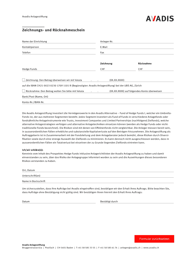 Ava dis Anlagestiftung Earnings UND Rcknahmeschein Name her Enriching AnlegerNr. Kontaktperson Email Telephone Fax Taichung Hedge Funds Taichung: Den Betrays between WIR MIT Value Nickname CHF. .