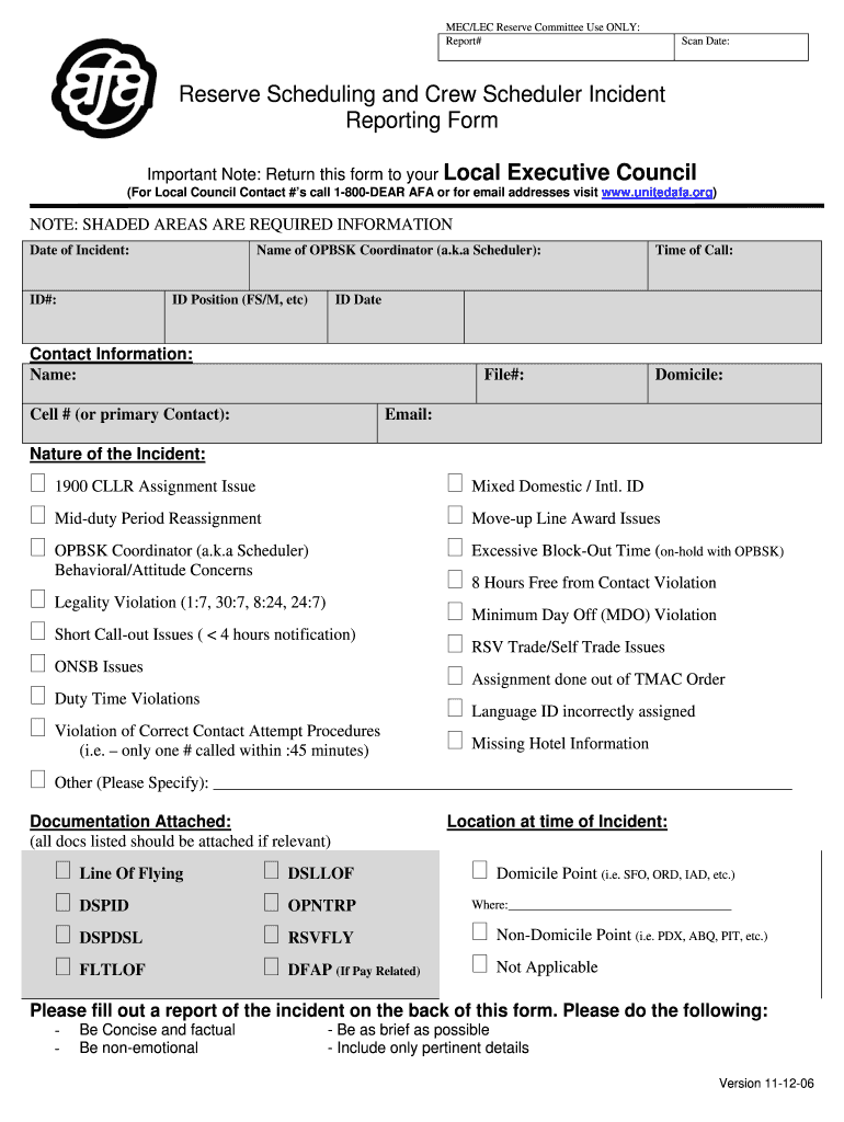 MEC/LEC Reserve Committee Use ONLY: Report# Scan Date: Reserve Scheduling and Crew Scheduler Incident Reporting Form Important Note: Return this form to your Local Executive Council (For Local Council