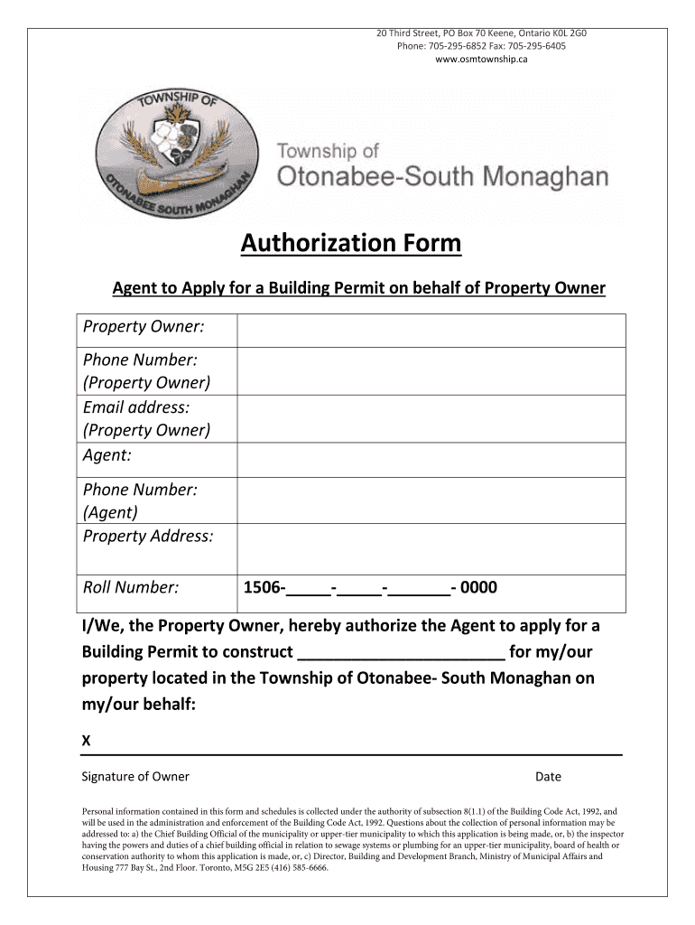 20 Third Street, PO Box 70 Keen, Ontario K0L 2G0 Phone: 7052956852 Fax: 7052956405 www.osmtownship.ca Authorization Form Agent to Apply for a Building Permit on behalf of Property Owner: Phone Number: