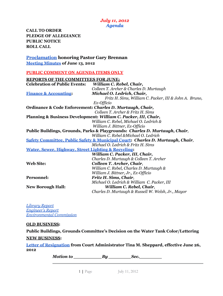 July 11, 2012, Agenda CALL TO ORDER PLEDGE OF ALLEGIANCE PUBLIC NOTICE ROLL CALL Proclamation honoring Pastor Gary Brennan Meeting Minutes of June 13, 2012, PUBLIC COMMENT ON AGENDA ITEMS ONLY REPORTS
