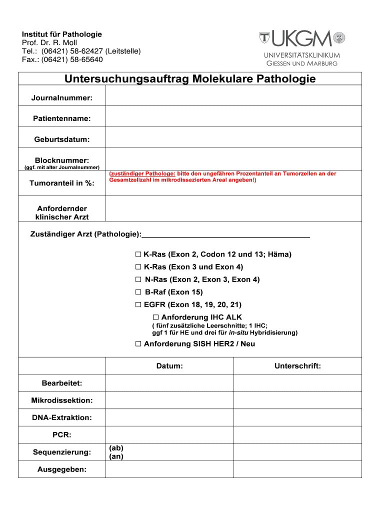 Institute for Pathologic Prof. Dr. R. Moll Tel.: (06421) 5862427 (Easterly) Fax.: (06421) 5865640 Untersuchungsauftrag Molecular Pathologic